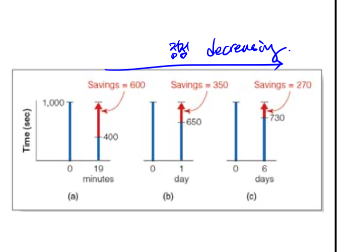 -> 그러니까 쉽게 설명하자면, 처음에는 기억하는 데 1000초가 걸렸던 것이, 19 분 뒤에는 고작 400 초가 걸리고 하루 뒤에는 그것보다는 많은 시간인 650 초가, 6 일 뒤에 외우려면 730 초가 걸리는 것이다. 즉, 재학습하는 시간까지 딜레이가 많이 될수록 학습에 필요한 시간도 증가하게 되는 것임.
