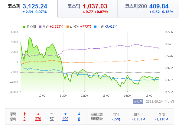 앞서 추석 연휴 이후 첫 거래일이었던 지난 23일 한국 증시는 중국 헝다그룹 관련 리스크가 부각되며 하락세를 보였다. 이후 간밤 외신 등을 통해 중국 정부 당국자들이 헝다의 파산 위기에 대비하라고 지시했다는 보도가 나오는 등 우려가 잦아들자 개인이 순매수에 나섰다. 다만 외국인과 기관은 나란히 매도에 나선 탓에 지수는 장 초반의 오름폭을 유지하지는 못했다.