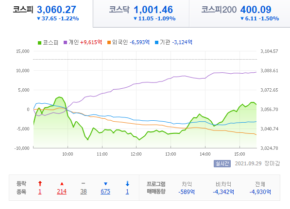 이날 코스피 지수는 전일 대비 37.65p(1.22%) 내린 3060.27로 거래를 마쳤다. 장중에는 2% 넘게 떨어져 3030선까지 빠지기도 했다.