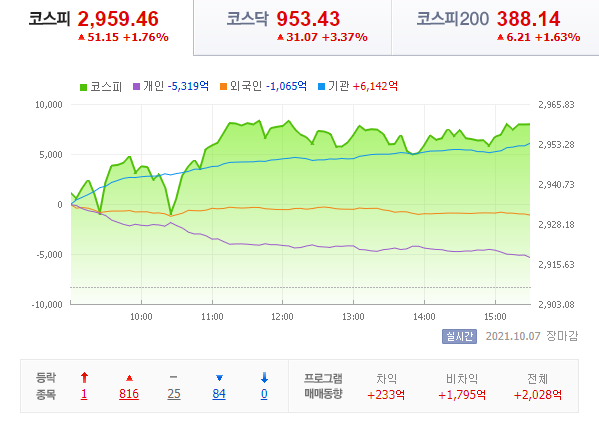 전날(6일) 연저점까지 추락했던 코스피 지수가 7일 반발매수세 유입에 힘입어 1.7% 반등하며 2950선을 회복했다. 코스닥 지수도 3% 넘게 올랐다. 7일 코스피 지수는 전날 대비 51.15p(1.76%) 상승한 2959.46으로 거래를 마쳤다. 기관이 6136억원을 순매수하며 상승을 주도했다. 개인은 5220억원을 순매도했고 외국인도 1045억원을 팔았다. 코스피 시가총액 상위 10개 종목 중에선 그간 규제 이슈와 금리인상 우려 등으로 부진했던 카카오와 네이버가 크게 반등했다.