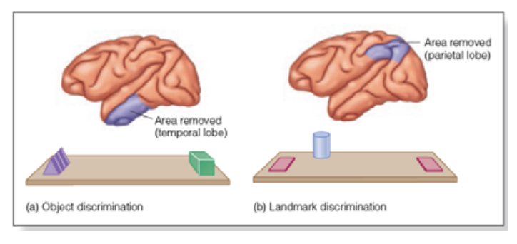 Figure 3.30 The two types of discrimination tasks used by Ungerleider and Mishkin. (a) Object discrimination: Pick the correct shape. Lesioning the temporal lobe (purple-shaded area) makes this task difficult. (b) Landmark discrimination: Pick the food well closer to the cylinder. Lesioning the parietal lobe makes this task difficult.