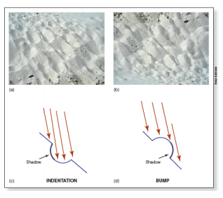Figure 3.23 (a) Indentations made by people walking in the sand. (b) Turning the picture upside down turns indentations into rounded mounds. (c) How light from above and to the left illuminates an indentation, causing a shadow on the left. (d) The same light illuminating a bump causes a shadow on the right.