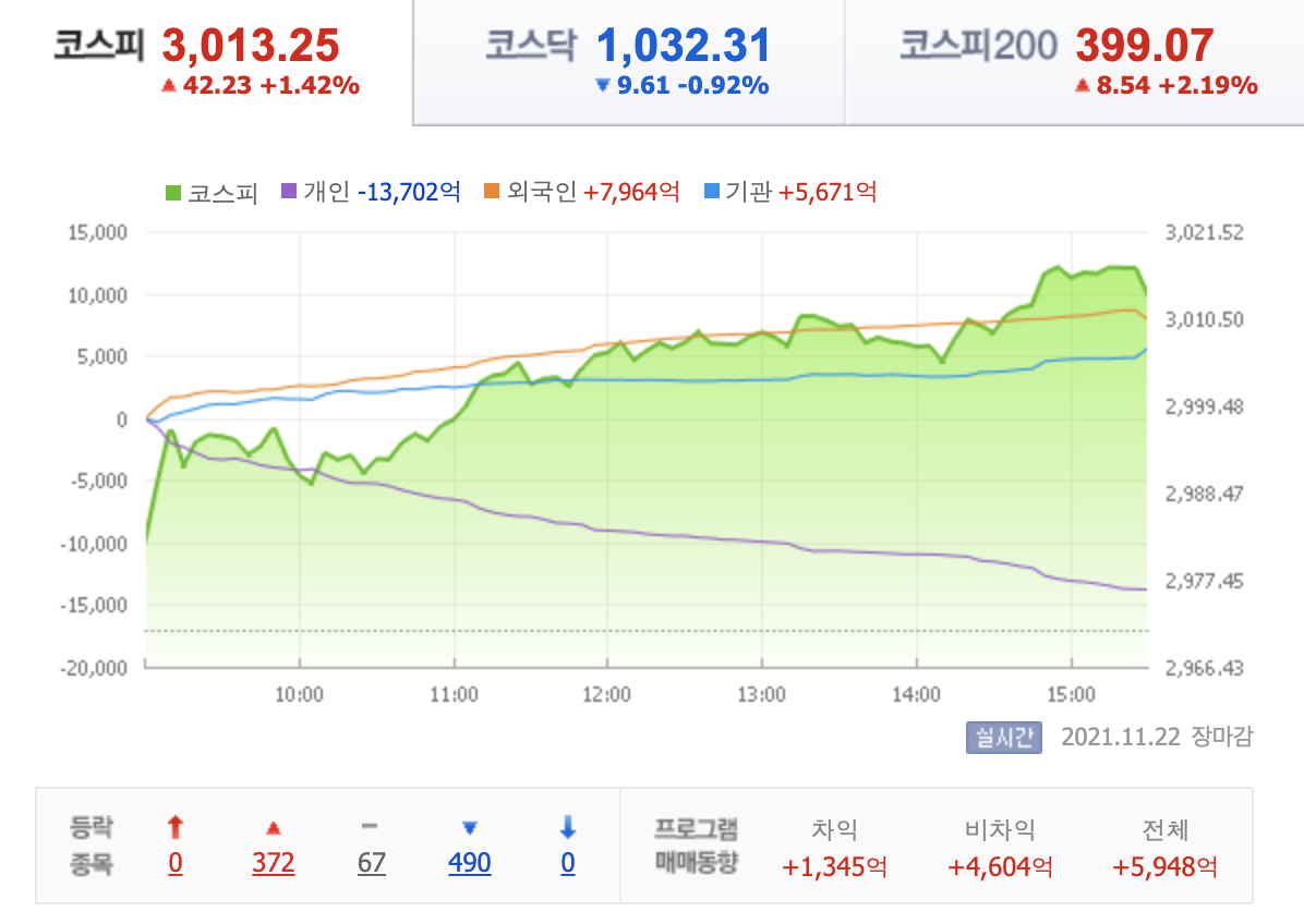 22일 코스피 지수가 외국인과 기관의 동반 매수에 힘입어 3010선을 회복했다. 반도체 업황 바닥 기대감에 시가총액 1위 삼성전자와 2위 SK하이닉스가 급등한 게 주된 요인으로 작용했다. 반면 코스닥 지수는 약 1% 하락 마감했다. 이날 코스피 지수는 전거래일 대비 42.23p(1.42%) 오른 3013.25로 마감했다. 코스피 지수가 '삼천피'를 회복한 것은 종가 기준 지난 2일(3013.49) 이후 14거래일만이다.