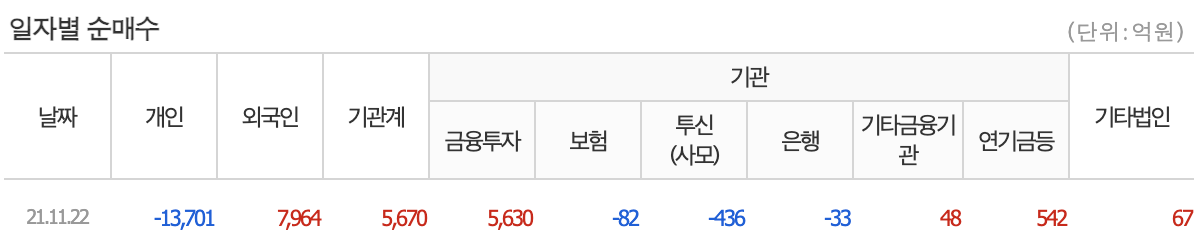 외국인과 기관이 각각 7977억원과 5672억원을 순매수했다. 반면 개인은 1조3698억원을 순매도했다.