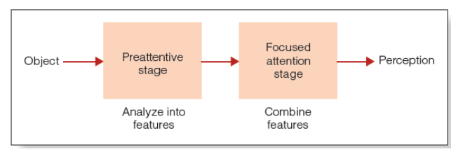 그림 4.30 Treisman 특징 통합 이론의 단계 물체는 사전 주의 단계에서 형상으로 분석되며, 그 형상은 나중에 주의의 도움과 결합된다.