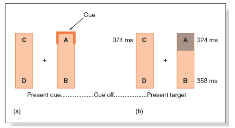 ***객체 기반 시각적 주의는 관심의 강화 효과가 대상 전체에 퍼진다는 것이다. 이는 정적 장면 또는 물체가 거의 없는 환경이나 동적 사건들이 있는 특정 객체를 기반으로 주의가 발생한다. 그렇기 때문에 Egly의 실험에서 객체 기반의 이익이 있었던 이유는 참가자들에게 동적 사건이 있는 특정 객체를 보여 주고 이에 따라 반응 시간을 측정했다.