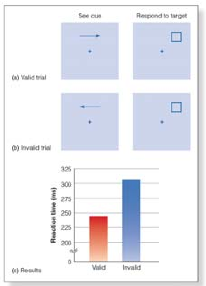 Figure 4.16 Procedure for (a) valid trials and (b) invalid trials in Posner et al.’s (1978) precueing experiment; (c) the results of the experiment. The average reaction time was 245 ms for valid trials but 305 ms for invalid trials.