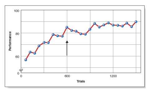슈나이더와 쉬프린(1977) 실험에서의 연습에 의한 성능 향상. 화살표는 참가자들이 작업이 자동화된 것으로 보고한 지점을 나타낸다. 이것은 기억장치에서 4개의 표적 자극과 각 시험 틀에서 2개의 자극이 있었던 실험의 결과물이다.