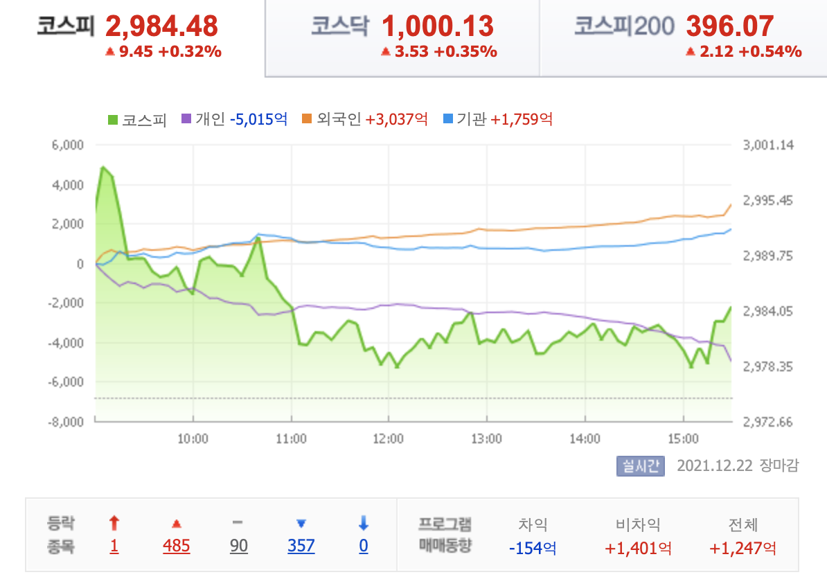 22일 코스피는 전 거래일 대비 9.45포인트(0.32%) 오른 2984.48에 마감했다. 이날 18.47포인트 상승 출발한 지수는 장중 3000포인트를 회복하기도 했지만 상승분을 반납하며 강보합권에서 거래를 마쳤다. 외국인과 기관이 동반 '사자'로 나서며 지수 상승을 이끌었다.