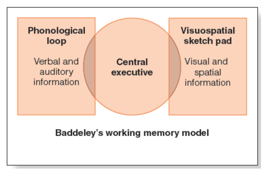 그림 5.10 Baddley와 Hitch's(1974; Baddley, 2000) 모델의 3가지 주요 구성 요소: 음운 루프, 시각적 스케치 패드 및 중앙 집행부