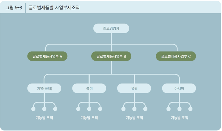 ▷ Organizational structure in which each product division manages both domestic and overseas business. ->각 제품 부서가 국내외 비즈니스를 모두 관리하는 조직 구조