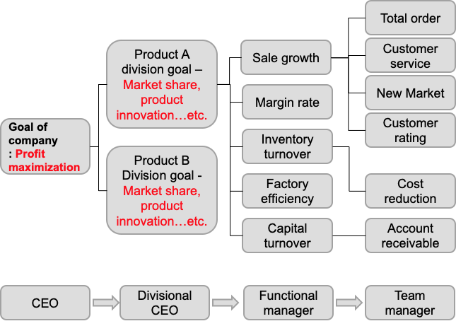 > The process of linking the goal of profit maximization to the goals of individual divisions throughout the entire company. - 이익 극대화라는 목표를 전사적으로 개별 사업부의 목표와 연계시키는 과정.